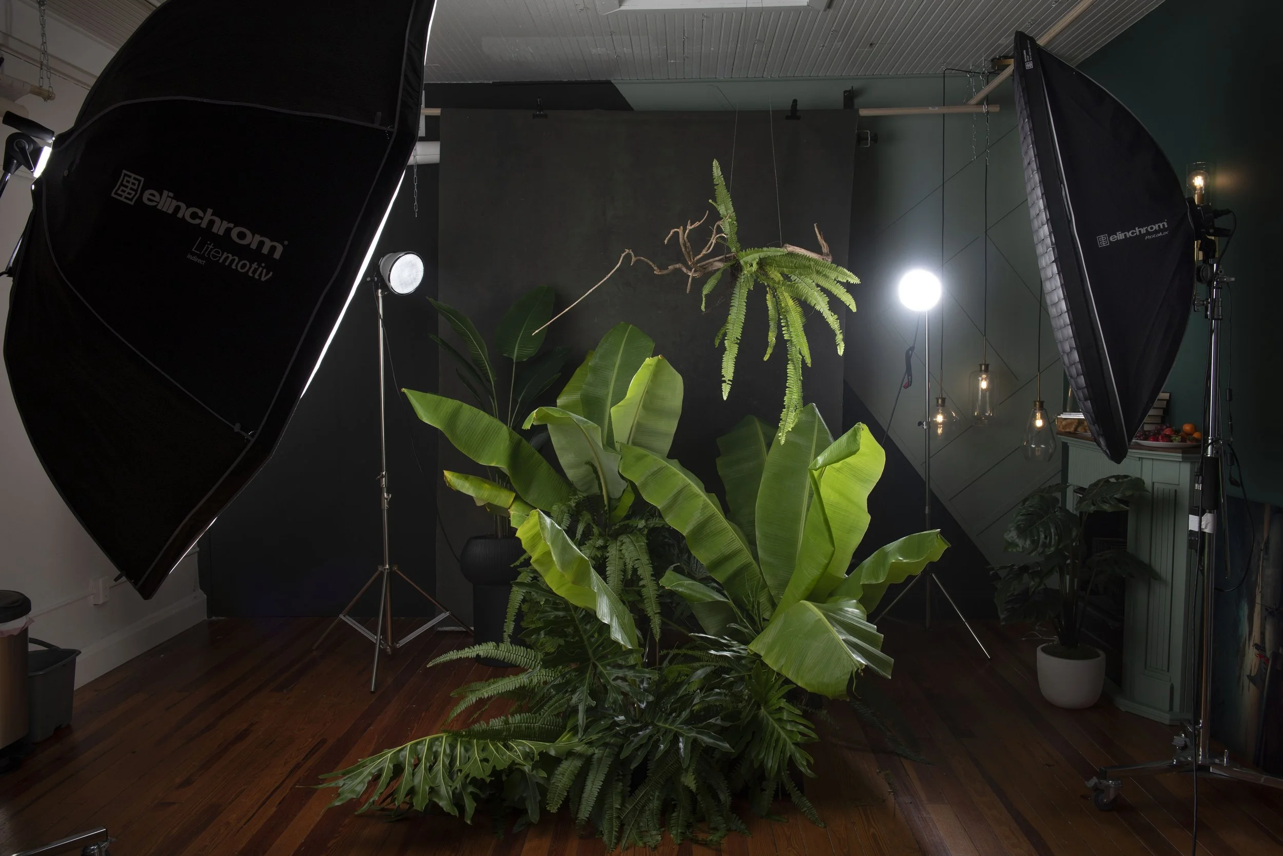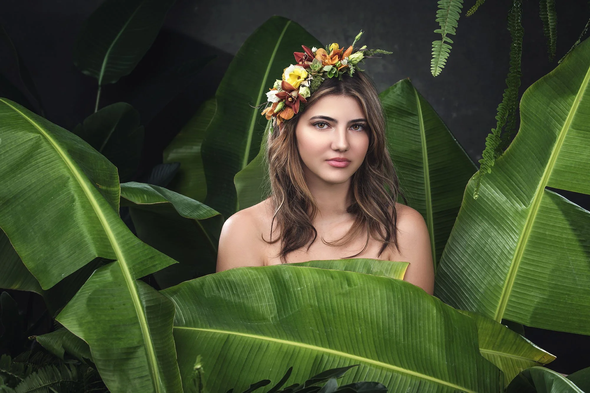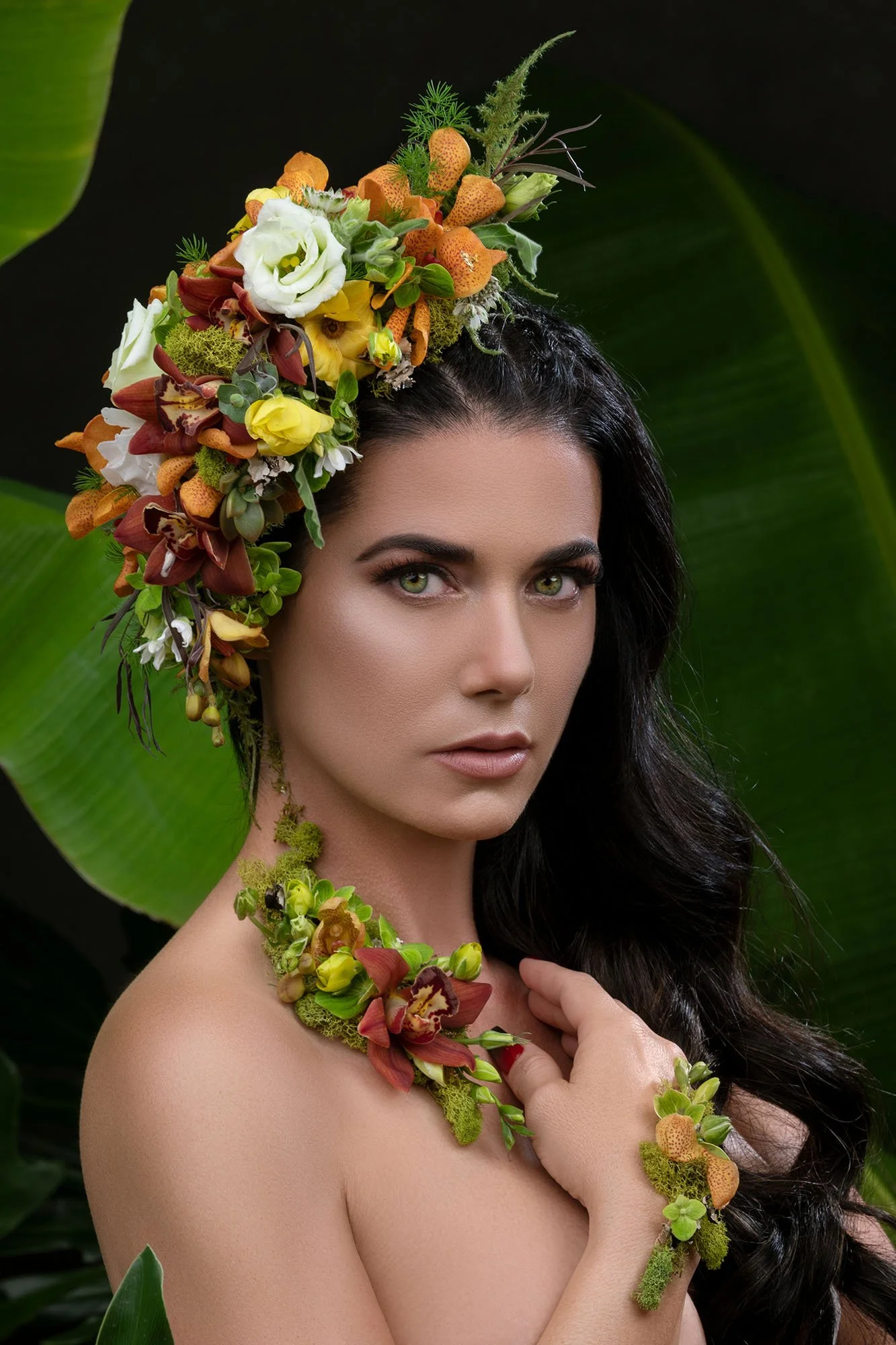 These particular leaves have a soft silky look to them that encompass the delicacy and tenderness in which we care for others and ourselves and were placed upwards in the studio to represent growth. The florist, Iryna Shulzhenko, added a floral pattern to the client’s skin as well as created a gorgeous headpiece to match and show strength and fierceness. While the background was created to represent a tree-crowded environment, the designs the clients wore were of softer and more colorful nature. The contrast was used as a means to convey the friendship between strength and gentleness. These are some of the ways in which the background can paint a picture and help capture a story.